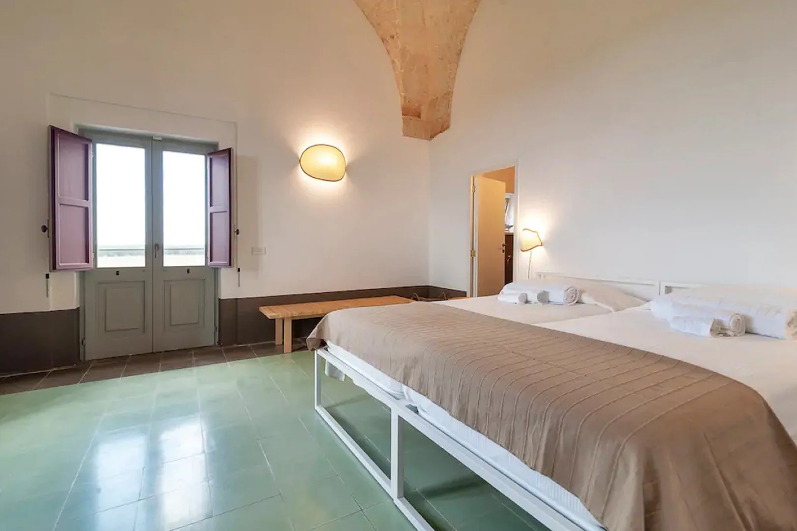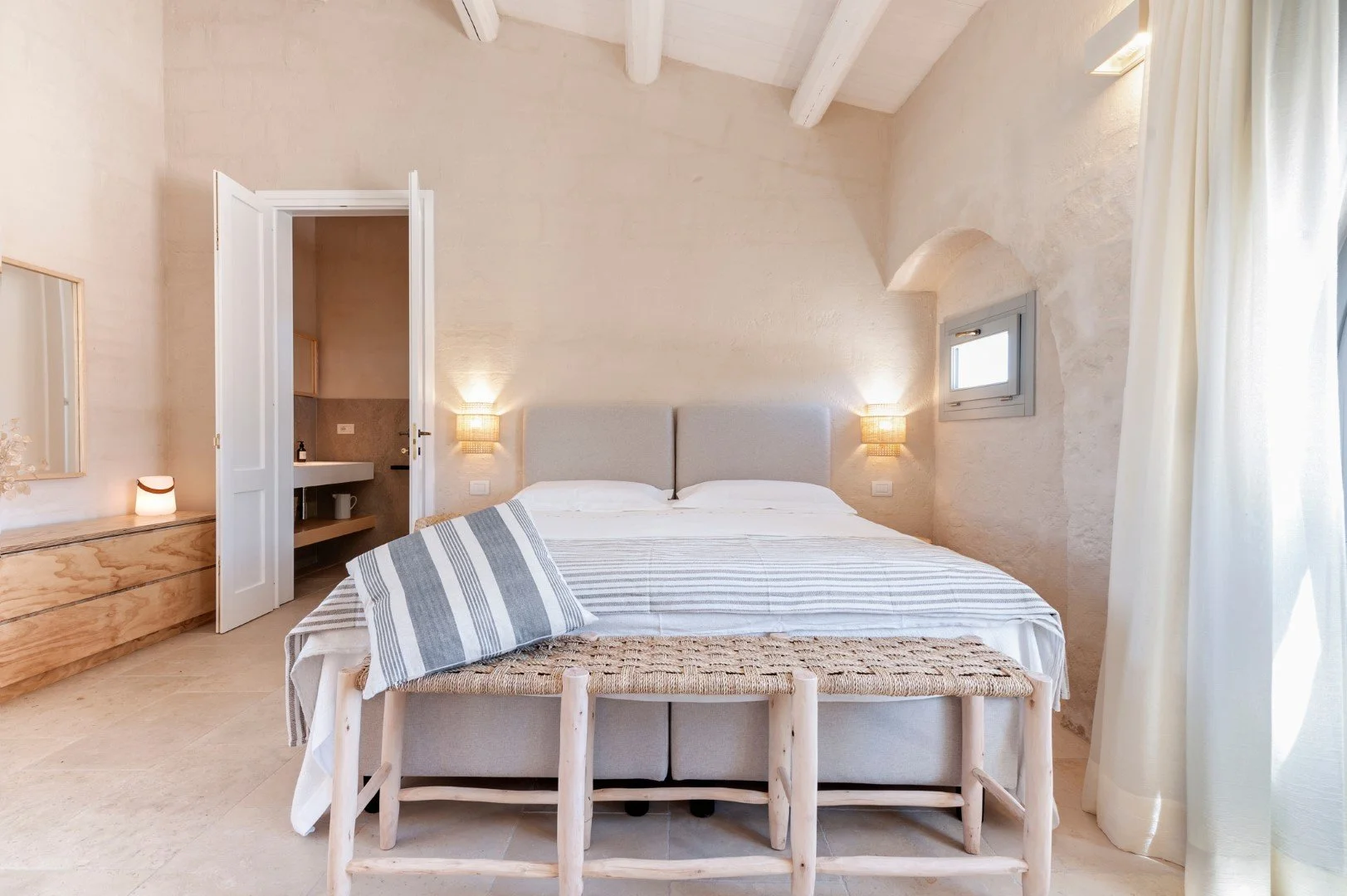 The aerial room feels light, bright and beautifully open — a space where soft tones blend with timeless Italian décor to create an effortless sense of calm. It includes a private ensuite with a shower, offering comfort throughout your stay.